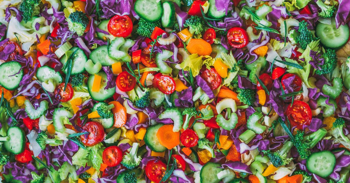 - Arrange the shrimp, crab meat, avocado, corn, cherry tomatoes, cucumber, and chives in rows on top of the spinach.