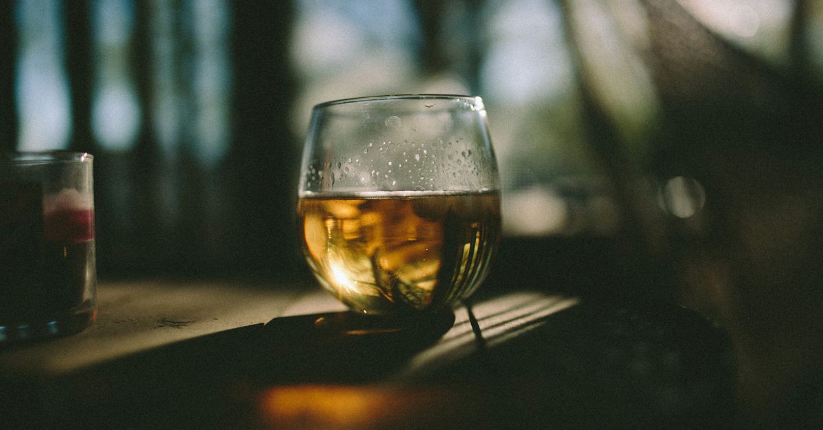- Fill the glass with a big ice cube (or a few smaller ones, if that’s what ya got). Bigger cubes melt slower, so you ain’t dilutin’ your drink too fast.